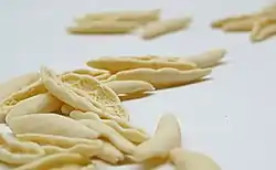 Capunti is a kind of short convex oval pasta resembling an open empty pea pod.[1]