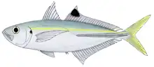 The false scad is a moderately large species, growing to a known maximum length of 60 cm and a weight of 1 kg,[7] although is more common at lengths of around 35 cm. The species has a much different body profile to most other species of Caranx, possessing an elongate, slightly compressed body in place of the deep, oblong shaped forms of its larger relatives. The species dorsal profile is approximately as equally convex as the ventral profile.[10] The dorsal fin is in two distinct parts, the first consisting of 8 spines while the second has 1 spine and 28 to 32 soft rays. The anal fin consists of 2 detached spines anteriorly, followed by 1 spine and 25 to 28 soft rays. The soft rays located at the end of both the dorsal and anal fins are detached and only connected by a basal interradial membrane, forming a partially detached finlet. The pectoral and pelvic fins are both short.[10] The species lateral line is weakly arched anteriorly, becoming straight after the end of the dorsal fin lobe. The curved section has 45 to 55 scales present and 0 to 3 scutes, while the straight section contains 0 to 8 scales and 24 to 32 scutes. The shoulder girdle is smooth, lacking papillae.[10] The false scad has a well-developed adipose eyelid, particularly posteriorly, with both the jaws containing irregular narrow bands of fine teeth.[11] The species has 50 to 58 gill rakers and 24 vertebrae.[10]
