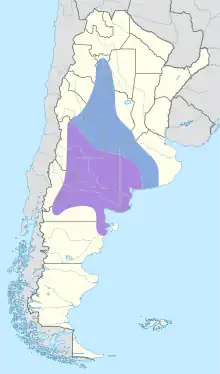 It is endemic to Argentina where its natural habitats are subtropical or tropical dry shrubland and temperate grassland.