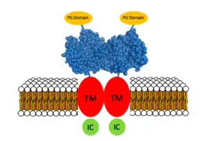 CA IX dimer with its four distinct pairs of domains labeled: the proteoglycan domain (PG), catalytic domain (blue), transmembrane segment (TM) and the intracellular tail (IC).