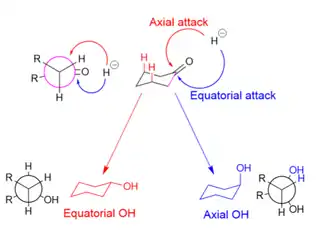 In the reduction of cyclohexanones, the hydride source can attack axially to produce an equatorial alcohol, or equatorially to produce an axial alcohol. In axial attack (shown in red), the hydride encounters 1,3-diaxial strain. In equatorial attack (shown in blue), the hydride avoids the 1,3-diaxial interaction, but the substrate undergoes unfavorable torsional strain when the newly formed alcohol and added hydrogen atom eclipse each other in the reaction intermediate (as shown in the Newman projection for the axial alcohol).