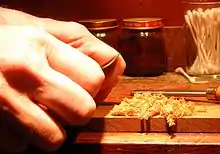 A card scraper or cabinet scraper is a woodworking shaping and finishing tool. It is used to manually remove small amounts of material and excels in tricky grain areas where hand planes would cause tear out. Card scrapers are most suitable for working with hardwoods, and can be used instead of sandpaper. Scraping produces a cleaner surface than sanding; it does not clog the pores of the wood with dust, and does not leave a fuzz of torn fibers.