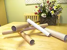 Corrugated fiberboard is a combination of paperboards, usually two flat liners and one inner fluted corrugated medium. It is often used for making corrugated boxes for shipping or storing products. This type of cardboard is also used by artists as original material for sculpting.[12]