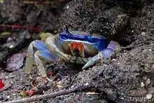 Cardisoma guanhumi, also known as the blue land crab or great land crab, is a species of land crab found in tropical and subtopical estuaries and other maritime areas of land along the Atlantic coast of the Americas from Brazil[2] and Colombia, through the Caribbean and Gulf of Mexico, to the Bahamas, and north to Ponce Inlet, Florida[3] Princess Place Preserve on the Palm Coast, and Bermuda.[4] The species varies in colour from dark blue to brown or pale grey, and may grow to 15 centimetres (6 in) in carapace width and weigh over 500 grams (18 oz).[3][5]