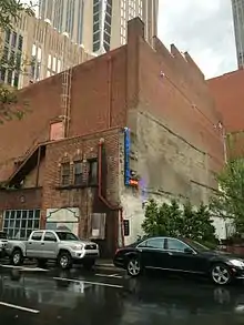 The Carolina Theatre opened in 1927, as part of Paramount Picture's Publix Theatre chain. The opening feature was the silent movie, A Kiss in a Taxi. Originally, movies ran for three days, and vaudeville performers were on stage Thursdays, Fridays and Saturdays.[1] In 1938, the theatre was renovated to accommodate sound films, with the original murals replaced with acoustic tiles. On Feb. 10, 1956, the theatre played host to a performance by Elvis Presley.[2] In 1953, the theatre installed a panoramic screen to accommodate CinemaScope films. In 1961, it was further renovated to accommodate Cinerama films.[3] The Sound of Music would premiere at the Carolina Theatre on March 31, 1965, and run a record 79 weeks. The 398,201[1] people who saw the movie were more than the population of Charlotte, at the time. With rising competition from suburban multiplexes,[4] the theatre closed on Nov. 27, 1978, with a showing of Bruce Lee’s Fists of Fury.[5] Arson furthered damaged the theatre[6] in the 1980s.
