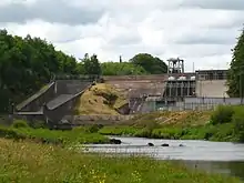 The Carrigadrohid hydroelectric plant, along with its sister plant constructed 20 kilometres (12 miles) downstream on the River Lee at Inniscarra, formed the fourth major hydroelectric development undertaken by ESB. Construction of the reinforced concrete gravity dam started in 1952 and was complete in 1957.[1] The dam is 130 m (427 ft) long and 22 m (72 ft) high, and operates with an average head of 13 m (43 ft).[4] It is constructed of nine blocks, each between 9.1 and 18.6 metres (30 and 61 feet) in length, and is fitted with three ground sluices and a spillway weir.[2]