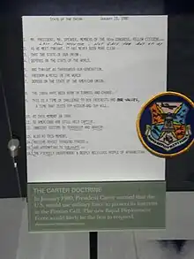 The Carter Doctrine was a policy proclaimed by President of the United States Jimmy Carter in his State of the Union Address on January 23, 1980, which stated that the United States would use military force, if necessary, to defend its national interests in the Persian Gulf. It was a response to the Soviet Union's intervention in Afghanistan in 1979, and it was intended to deter the Soviet Union, the United States' Cold War adversary, from seeking hegemony in the Persian Gulf region.
