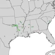 Nutmeg hickory is the rarest species in the genus, occurring in a few areas scattered in southeastern North Carolina, eastern South Carolina, central Alabama and Mississippi, northern Louisiana, southern Arkansas, eastern Texas, and northeastern Mexico. The species is typically found in river bottomlands with calcareous soil or marl ridges.[2] The species is abundant only near Selma, Alabama, and in southern Arkansas. Nutmeg hickory has a native range nearly identical with that of Durand Oak (Q. durandii var. durandii). Both may be relics of a more ancient flora than now occupies the region.[3]