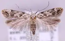 The length of the forewings is 5.5–6.5 mm for males and 6–7 mm for females. The forewings are whitish, mottled with light brown and orange-brown.[3] Adults have been recorded on wing from early July to early September.