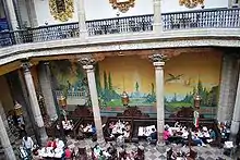 Early in the 20th century, Frank Sanborn and his brother Walter opened a small soda fountain/drugstore on Filomeno Mata Street in the historic center of Mexico City, calling it Sanborns American Pharmacy[2] In 1917, the two brothers saw the old mansion as a place to expand their business. They took two years to remodel it, putting a stained-glass roof over the main courtyard, putting in new floors and adding a peacock mural by Romanian painter Pacologue. A less important mural was painted by José Clemente Orozco in 1925 called Omnisciencia, solicited by his friend Francisco-Sergio (Paco) de Yturbe with the approval of the Sanborns brothers.[1] A restaurant covered the inner courtyard and now dominates the establishment, which now is the flagship site for a chain of restaurants called Sanborns.[9][12] The building was declared a national monument in 1931.[12] Since the early 20th century, this Sanborns has been a popular place to have a meal in luxurious surroundings.[9] The business has hosted painters, writers, actors, poets and revolutionaries. It was a symbol of a cosmopolitan atmosphere in the first half of the 20th century.[2] The building was restored again between 1993 and 1995 after suffering a minor fire on the second floor. This project was aimed at preserving the elements of the building dating from the Baroque period, the French and Art Nouveau elements of the late 19th and early 20th centuries, as well as the two murals, which had deteriorated considerably.[1] Sanborns currently belongs to billionaire Carlos Slim.