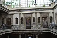 The most notable feature of the exterior are the blue and white tiles from Puebla that cover the building on three sides. Its windows, balconies and doors are framed in carved stone and French porcelain crowns on the Callejón de la Condesa and Madero Street facades.[1][8] Inside, the main courtyard contains a fountain crowned with mosaics. The fountain is surrounded by highly decorated columns and topped with more French porcelain crowns as well as a stained glass roof that was added in the 20th century. Both the fountain and columns show some damage. On the second floor, the courtyard railings are made of copper; some made in China and some made in Mexico. The overall look to the courtyard is generally Baroque but also somewhat Mudéjar.[1]