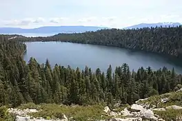 Cascade Lake is a glacial lake located in El Dorado County, California approximately 1 kilometre (0.62 mi) from Lake Tahoe. Cascade Lake is the second largest tributary lake feeding into Lake Tahoe. Its depth is 170 feet (52 m), 1 mile (1.6 km) long and 0.5 miles (0.80 km) wide.[2] The lake is also within three to four miles from its neighboring lake, Fallen Leaf Lake, and Emerald Bay.