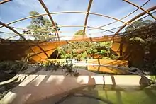 Platypusary at Healsville sanctuary (also known as BHP Billiton Platypusary) was opened to the public on 12 May 2005.[19] Its façade comprises gold panels with inscribed leaf shapes and encloses a ponds of water running like a native creek.[12] The passing of sun over these leaves casts complex shadows and reflections onto the marble ground of the platypusary.[20]
