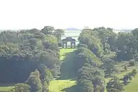 The original Triumphal Arch, situated on top of the hill 1⁄2 mile (800 metres) opposite the south front of the house and on the same axis as the sham castle behind, was built by Lord Clinton in 1730. It had been allowed to become covered in ivy and in 1951 collapsed during a strong wind. Following the death of both her parents in 1958, Lady Margaret Fortescue in 1961 rebuilt the Arch in its original form in their memory. Financial contributions were made by the tenants of the estate and by friends of the family. The modern structure is of reinforced concrete faced with the original stone.[7]