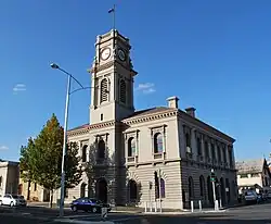 In 1872, the Department of Public Works' architect John James Clark prepared drawings for additional public offices, which included the post and telegraph offices, sub-treasury, water supply office and quarters. This complex was completed by 1875 on a site adjoining the old post office, at a cost of £10,540. The clock bell was supplied by William J. Horwood's local Albion Foundry in 1878–9, and was "the first large bell successfully cast in Victoria".[2] A clock for the tower was also supplied in this year by T. Gaunt. A telephone exchange was established in April 1907. In 1908, Thomas Odgers converted the battery room into a sorting and receiving room and the telegraph room, mail room and letter carrier room into the public space. At the time of construction, the building was described as "the public offices were second to none outside Melbourne for architecture and compactness".[3][1]