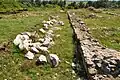 Directly west of the Principia, two larger buildings were uncovered, which were referred to as Horrea due to their massive supporting pillars. Their walls do not run parallel to the principia, but deviate by about three meters from the axial alignment to their total length. The first horreum, located directly next to the staff building, is 29 m x 17.50 m (= 507.5 sqm), a rather unusual size for this type of building. Although similarly spacious Horrea have also been proven in other auxiliary sites, it is always double Horrea, which is not indicated by any structural structures or other signs in Cigmău, so that a one-room large building must be assumed. The second Horreum, 28.50 m x 10.50 m (= 299.25 sqm), meets the usual standards.