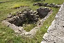 Notwithstanding the unusual shape of the camp floor plan, the principia (staff buildings) have a regular, rectangular (approaching a square) and symmetrical floor plan with a north-south axis of 34 m and an east-west axis of 35 m length. This results in a building area of 1,190 sqm. The building complex has an inner courtyard of 13 m by 18 m (= 234 sqm), bordered on three sides by porticos and bounded by functional rooms. The entrance in the form of a six metre wide vestibule is located on the south side. To the north, the inner courtyard is bounded by a basilica, which extends across the entire width of the Principia, but only has a depth of five metres. In the eastern part of the basilica, traces of walls were found that can be interpreted with reservations as the remains of a tribunal. The hall is closed by a 3.50 m deep escape from a total of six rooms. These rooms have different widths, so that despite the even number of rooms the flag sanctuary (aedes or sacellum) is located in the symmetry axis of the building complex (east of the aedes are two rooms, west three rooms). The cellar of the flag sanctuary, in which the troop treasury was traditionally kept, is still well preserved.