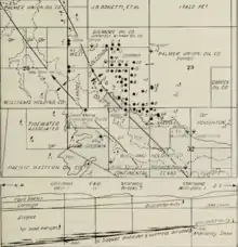 Oil discoveries in the 1880s and 1890s in Los Angeles County, and along the south coast of Santa Barbara County, encouraged drillers to investigate the northern part of Santa Barbara County, and they were quickly rewarded, with the discovery of the huge Orcutt field in 1901 and the Lompoc field in 1903. The first attempts to find oil in the Cat Canyon area took place in 1904, with two attempts by Rice Ranch Oil Co. to find oil or gas. Both wells failed on boulders and loose sand which plugged the well bores. Palmer Oil Company succeeded in 1908, drilling to 3,200 feet with a well that producing 150 barrels a day. Compared to the gigantic gushers of the Orcutt field, it was a modest success at first.[11] However, after several months it began to flow, and then spout, becoming an immense gusher producing in excess of 10,000 barrels per day before clogging up with sand and ceasing altogether.[12][13] Similarly, oil in the east area of Cat Canyon was discovered by Brooks Oil Company in 1909 when Well No. 1 was drilled to a depth of 2,615 feet.[14]
