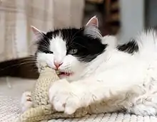 Object play for cats is the use of inanimate objects by the animal to express play behaviour.[3] In the case of pet domestic cats, humans normally provide them with purchased, human-made toys such as toy mice, bird or feather toys, or toy insects. These may be suspended from a string attached to a wooden or fishing-style rod designed to simulate lifelike activity in the toy, triggering the cat's predatory instincts – this game is known as catfishing.[4] Cat play can be enriched with the addition of obstacles behind which the prey can hide and items that make sound when the toy moves through them such as dried leaves, grass, or even a paper bag. When it comes to non-domestic, wild cats, they may use several objects in the wilderness as their toys including sticks, leaves, rocks, feathers, etc. Play behaviour includes throwing, chasing, biting, and capturing the toy object, mimicking behaviors used during an interaction with a real source of prey. Engaging in object play helps young cats practice these adult skills.[3]