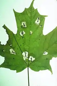 The larvae feed on Acer species.[3] They skeletonise the leaves of their host, resulting in a trumpet construction.