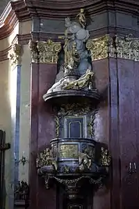 The Late Baroque pulpit was built in a sumptuous classicizing style similar to Franz Anton Hillebrandt's main altar. The sculpture group on the top of the abat-voix (Triumph of the Church over Idolatry) represents the same topic as the fresco on the first vault. The frescoes of the church were finished by Johann Cymbal in 1768 giving an approximate date after which the pulpit could have been erected.