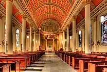 View of the west end of the nave from the organ balcony showing sanctuary and apse.