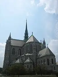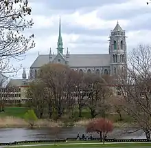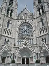 The building, facing Branch Brook Park, is generally regarded as the "most perfect and exact example of French Gothic architecture in the Western Hemisphere."[3][4] Construction began in 1899 and was finished in 1954. The original design called for an English-Irish Gothic Revival church, but plans were later modified in favor of a French Gothic Revival style.[5][6]