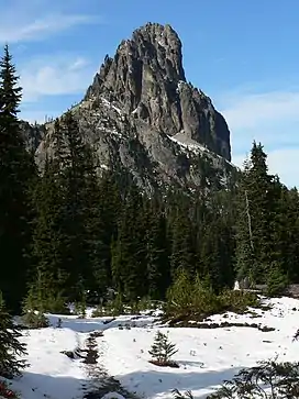 Cathedral Rock is an intrusive andesite volcanic complex, once being a stratovolcano with Mount Hinman, Mount Daniel, and The Citadel.[2] The Alpine Lakes Wilderness features some of the most rugged topography in the Cascade Range with craggy peaks and ridges, deep glacial valleys, and granite walls spotted with over 700 mountain lakes.[5] Geological events occurring many years ago created the diverse topography and drastic elevation changes over the Cascade Range leading to the various climate differences. These climate differences lead to vegetation variety defining the ecoregions in this area.