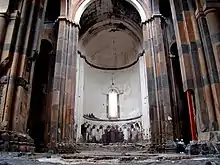 The cathedral is a domed, centrally-planned basilica.[lower-alpha 5] Varazdat Harutyunyan argues that in its plan and dimensions, it reproduces two 7th century domed basilicas—Cathedral of Mren and Saint Gayane Church.[28] According to Richard Krautheimer it derives its plan from that of the 7th century Cathedral of Talin, with only minor differences.[82] The dome was supported on pendentives and stood atop the "intersection of four barrel vaults elevated to a cruciform design and topped with gabled roofs." In the interior, "freestanding piers divide the space into three aisles, the nave of which terminates in an eastern apse flanked by two story side chapels."[83] Sirarpie Der Nersessian noted that its interior is imposing "through the harmony of the proportions." She added, "The blind arcade with slender columns and ornate arches, the delicate interlaces carved around the door and windows add to the beauty of the exterior."[84]