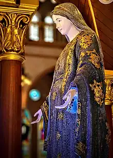 The centre piece of the inside of the cathedral is the statue of the Virgin Mary. It is covered by semi precious gems donated by the local congregation – estimates of the number of gems range from 200,000 to 500,000.[10]