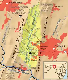 Catoctin Creek is a 27.9-mile-long (44.9 km)[1] tributary of the Potomac River in Frederick County, Maryland, USA. Its source is formed north of Myersville. In Myersville, it merges with the Little Catoctin Creek at Doub's Meadow Park.[2] From there, it flows directly south through Middletown, and the southern Middletown Valley for the entire length of the stream collecting several smaller tributaries. It makes a crossing with the Chesapeake and Ohio Canal at the Catoctin Aqueduct, one of just 11 of these structures to survive.[2] Catoctin Creek enters the Potomac River east of Brunswick.