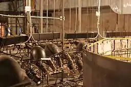Most catwalks have several battens (pipes) that lighting fixtures may be attached to. Lights are usually attached by a C-Clamp or a hook clamp around the pipes. In addition to this primary attachment, fixtures generally have an additional safety cable attaching them to the catwalk, so that if the clamp or bolt gives way, the safety cable will catch the light. This is used because the lights are generally very expensive and heavy, but mainly to protect the audience members and performers from the possibility of fixtures falling down from the catwalks. Catwalks often include a platform for a spotlight operator to work from.