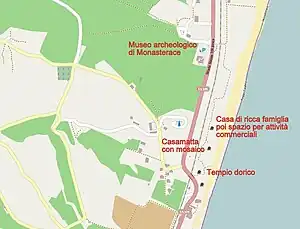 In 1969 a mosaic depicting a dragon was discovered in what is now called the "House of the Dragon". It was first exhibited in the Museo Nazionale della Magna Grecia, but was restored and transferred to the Monasterace Archeological Museum in 2012.[15]