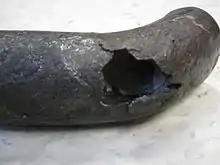 A tube damaged by caustic embrittlement. White caustic deposits can be seen inside.