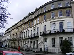 Unusually for a Bath terrace, some of the houses have painted exteriors. In other parts of the country, Georgian houses were painted, but Bath stone was usually considered presentable enough without paint.[3]