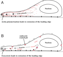 The leading edge at the front of a migrating cell is also the site at which membrane from internal membrane pools is returned to the cell surface at the end of the endocytic cycle.[16][17] This suggests that extension of the leading edge occurs primarily by addition of membrane at the front of the cell. If so, the actin filaments that form there might stabilize the added membrane so that a structured extension, or lamella, is formed — rather than a bubble-like structure (or bleb) at its front.[18] For a cell to move, it is necessary to bring a fresh supply of "feet" (proteins called integrins, which attach a cell to the surface on which it is crawling) to the front. It is likely that these feet are endocytosed [19] toward the rear of the cell and brought to the cell's front by exocytosis, to be reused to form new attachments to the substrate.