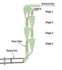 The key component of the gas-suspension preheater is the cyclone. A cyclone is a conical vessel into which a dust-bearing gas-stream is passed tangentially. This produces a vortex within the vessel. The gas leaves the vessel through a co-axial "vortex-finder". The solids are thrown to the outside edge of the vessel by centrifugal action, and leave through a valve in the vertex of the cone. Cyclones were originally used to clean up the dust-laden gases leaving simple dry process kilns. If, instead, the entire feed of rawmix is forced to pass through the cyclone, a very efficient heat exchange takes place: the gas is efficiently cooled, hence producing less waste of heat to the atmosphere, and the raw mix is efficiently heated. The heat transfer efficiency is further increased if a number of cyclones are connected in series.