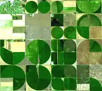 Center-pivot irrigation (sometimes called central pivot irrigation), also called water-wheel and circle irrigation, is a method of crop irrigation in which equipment rotates around a pivot and crops are watered with sprinklers.[1][2] A circular area centered on the pivot is irrigated, often creating a circular pattern in crops when viewed from above (sometimes referred to as crop circles, not to be confused with those formed by circular flattening of a section of a crop in a field).[3] Most center pivots were initially water-powered, however today most are propelled by electric motors.
