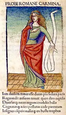 ![]() The first five lines of De laudibus Christi with a depiction of the author, Faltonia Betitia Proba, holding a scroll | |