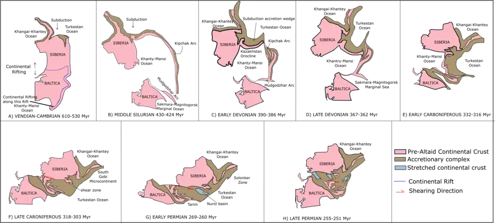 This hypothesis suggests that Baltica craton was attached with Siberia craton during the period Ediacaran.[28] Their locations during Ediacaran were confirmed from paleomagnetic data.[28] Continental rifting between Baltica and Siberia happened from late Ediacaran to Cambrian (610-520 Myr).[28] During this period, collision of microcontinents and subduction happened at the north of the Siberia craton.[28] During the Middle Silurian (430-424 Myr), the Kipchak arc, which is the fragment formed due to the rifting of Baltica and Siberia, had its northern end attached to the Siberia craton and its southern end free from attachment to the Baltica craton.[28] Meanwhile, the accretionary complex formed during the subduction of microcontinents at the north of the Siberia craton and the amount of accretionary materials at the Kipchak arc decreased towards the southwest as it was more away from the source in Siberia.[28] During the Early Devonian (390-386 Myr), there was no more addition growth of subduction-accretion complexes at the southern end of the Kipchak arc due to the abrupt influx of thick layer of Early Devonian clastic materials and the simultaneous decrease in subduction-related magmatism.[28] This could be explained by collision of Mugodzhar arc at the north of Baltica with the southern end of the Kipchak arc.[28] On the other hand, a subduction-accretion wedge started to grow at the north of the Kipchak arc.[28] By Late Devonian (367-362 Myr), subduction-accretion and arc magmatism produced a continental crust that had a normal thickness.[28] During Early Carboniferous (332-318 Myr), the Baltica craton migrated towards Siberia craton, which led to the subduction under the original southern end of the Kipchak arc.[28] During the Late Carboniferous (318-303 Myr), Baltica and Siberia experienced right-lateral shearing, combined with compressional force, the entire Kazakhstan orocline became more tightly packed.[28] Until the Early Permian (269-260 Myr), the Nurol basin, which is a stretched continental crust, was formed and alkaline magmatism occurred at its basement.[28] Finally, during the Late Permian (225–251 Myr), the shearing direction of Baltica and Siberia reversed as the Gornostaev shear zone moved to the south and east of Siberia.[28] With this final act during the Late Permian, Sengor's hypothesis on the Central Asian Orogenic Belt evolution was completed.[28]