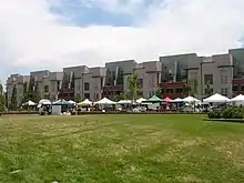 The Central Park neighborhood hosts a community festival with apartments in the background of "Founders Green" located in the urbanized Central Park that shares the neighborhood's name.