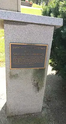The common itself is a rectangular area about 2.4 acres (0.97 ha) in size, out of which a smaller rectangle has been cut where City Hall is located. It is planted with mature trees, and has a network of paths as well as four major monuments. The oldest is a granite obelisk with urn designed by George F. Meacham and placed in 1867. A statue of native son, Governor of Massachusetts, and American Civil War General Nathaniel Prentice Banks, designed by Henry Hudson Kitson was placed in 1909, and a copy of "The Hiker", a memorial to veterans of the Spanish–American War, designed by Kitson's wife Theodora, was placed in the early 20th century. Within the Veterans Memorial Mall stands a lectern erected in 1973 commemorating Samuel M. Shriberg, a local business owner who founded Support Our Servicemen. Lastly, a memorial celebrating the city's centennial was placed in 1984.[2]