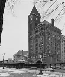 The Romanesque Revival structure, designed by Bradford L. Gilbert and built by the Illinois Central Railroad, opened April 17, 1893 to meet the traffic demands of the World's Columbian Exposition. The nine-story building featured a 13-story clock tower and housed the general offices of the railroad. It boasted the largest train shed in the world at the time, which measured 140 by 610 feet.