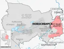 | Districts | Cherepanovsky, Koltsovo, Maslyaninsky, Moshkovsky, Novosibirsk (Dzerzhinsky, Oktyabrsky, Tsentralny), Novosibirsky (Baryshevsky, Berezovsky, Kamensky, Novolugovskoy, Plotnikovsky, Razdolnensky), Toguchinsky[1] |