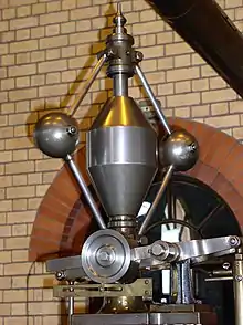 Centrifugal governors, also known as "centrifugal regulators" and "fly-ball governors", were invented by Christiaan Huygens and used to regulate the distance and pressure between millstones in windmills in the 17th century.[1][2] In 1788, James Watt adapted one to control his steam engine where it regulates the admission of steam into the cylinder(s),[3] a development that proved so important he is sometimes called the inventor. Centrifugal governors' widest use was on steam engines during the Steam Age in the 19th century. They are also found on stationary internal combustion engines and variously fueled turbines, and in some modern striking clocks.