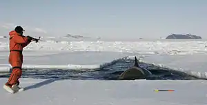 A researcher fires a biopsy dart at an orca. The dart will remove a small piece of the whale's skin and bounce harmlessly off the animal.