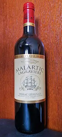 Château Malartic-Lagravière, originally Domaine de Lagravière, is a Bordeaux wine from the Pessac-Léognan appellation, ranked among the Crus Classés for red and white wine in the Classification of Graves wine of 1953 and 1959.[1] The winery and vineyards are located south of the city of Bordeaux, in the commune of Léognan.
