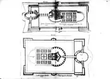 By reflecting the image of the château, the nymphaeum acts as a unifying element between the gardens and château. The vault of the basin is made of segments of alternating color. The exterior as well as the lintels of Level 1, is rusticated. In original plans of Du Cerceau, it is shown surrounded by bleachers forming a small theater. Yet the archaeological excavations suggest this was never present and the original plan for the nymphaeum was simplified. The current theories suggest a terrace wall separated the enclosed basin from the rest of the garden, interrupted by an access staircase. The plan of Du Cerceau could have corresponded to a project of later development that never came to fruition due to the abandonment of the site or the death of Antoine de Crussol. The nymphaeum was completely restored in 2012.[3]