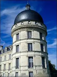 Relics of the 16th century include an outsized round tower at the western corner, capped by a dome à l'impériale, and the central block in the shape of a donjon, with a slender tower on each corner, grouped around the raking roof. Its feigned battlements are evocative of the Middle Ages, a retrospective formula stylistically derived from Chambord but somewhat vitiated by ample fenestration, including characteristic Renaissance dormers.
