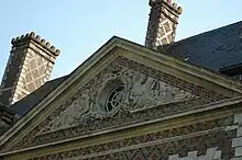 In 1598, Jacques Le Faë (d. ca. 1630), Adviser to the King, 'Controleur general des traites dominilales et impots en la province de Normandie', acquires the Alinette domaine from the Cormeilles Family on the 6th of April. He builds the present Château Louis de XIII style in bricks, works will only start in 1616 (exchange of contract only on 14 May 1607) and will be completed in 1632.[2] (The inscription 1616 can be found on one of the main chimneys.) He married Anne Petit, then died in 1630, and the estate is ruled by his wife on behalf of her nobles children until 1637. Adrien (d. ca. 1669) Le Fae Sieur de Bosc Theroulde, Adviser to the king, 'Maitre en sa Chanmbre de Normandie', inherited the Estate and was made escuyer in 1640. He built the chapel (1646–1648) along the Chateau, named after his patron saint, after being saved from the plague of Rouen (in 1637 in Rouen 11,000 people died in 10 months). Christophe Charles Le Faë (died 28 March 1707), Lord of Bosc Theroulde, Saint Germain, Mêtillon, La Mivoie and other places, adviser to the Parliament of Rouen, appointed on 3 March 1670, succeeded to Adrien and married Madeleine Le Roux (died 8 May 1719). A stone shield located on the west wing represents their respective merged family shields.